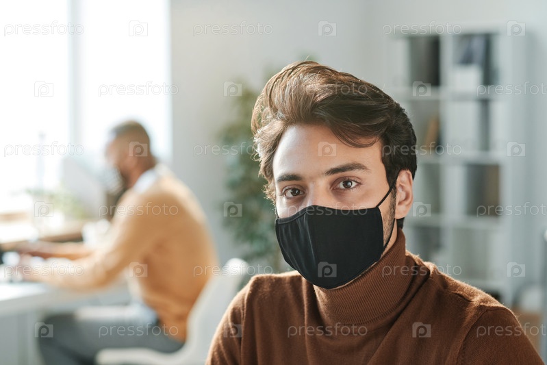 Портрет молодого менеджера компании смешанной расы с коричневыми волосами, одетого в коричневый гарнитур и черную маску в офисе