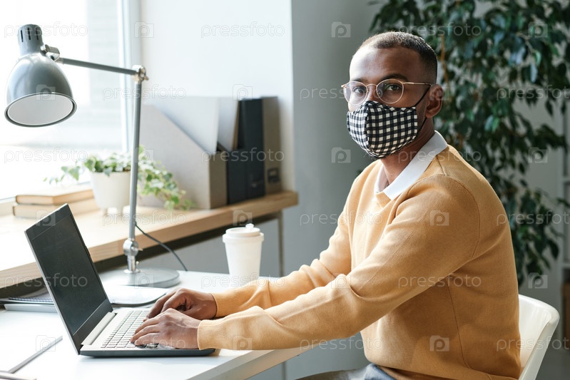 Портрет серьезного молодого менеджера смешанной гонки в квадратной маске и очках, сидящего за столом с ноутбуком в офисе