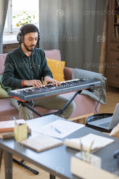 Молодая учительница музыки играет на клавиатуре пианино перед ноутбуком
