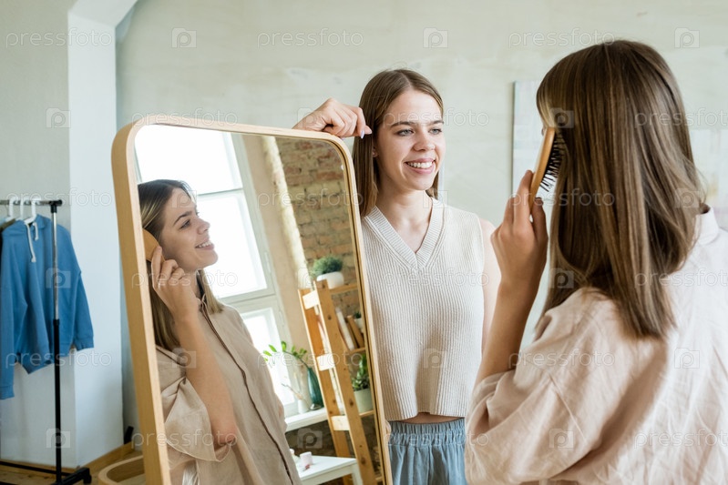 Счастливые подростковые близнецы стоят у большого зеркала и болтают