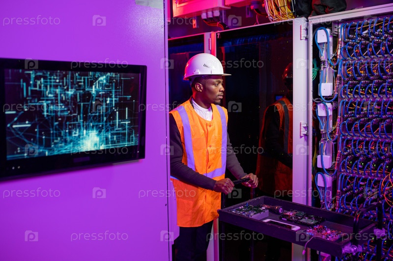 Системный инженер по безопасности толкает корзину с компонентами сервера