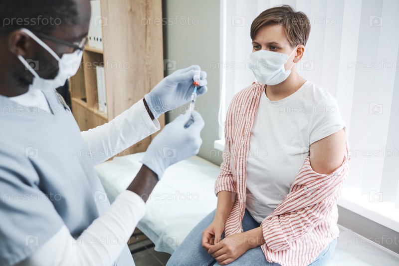 Медсестра заполняет шприц вакциной, в то время как пациент с маской сидит на диване в клинике