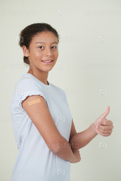 Вакцинированная девушка показывает палец вверх