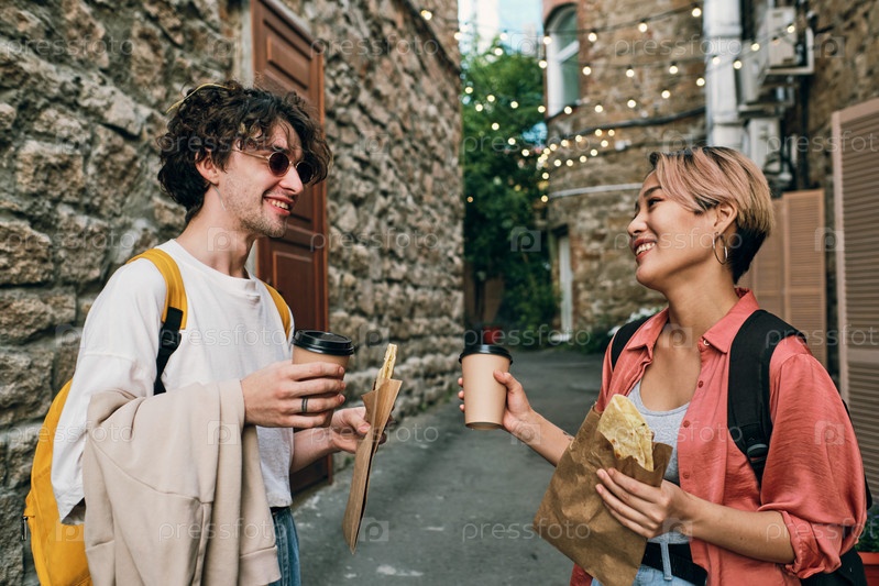 Счастливые молодые свидания с напитками и закусками, глядя друг на друга