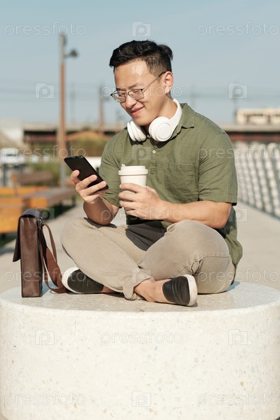 Счастливый молодой человек с напитком и смартфоном, отправляющий сообщения на улице