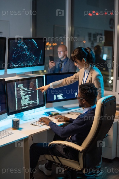 Молодая азиатская бизнесвуменка, указывающая на компьютерный экран