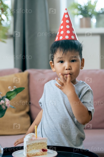 Милый мальчик в рождественской шляпе, дегустирующий торт и смотрящий на камеру