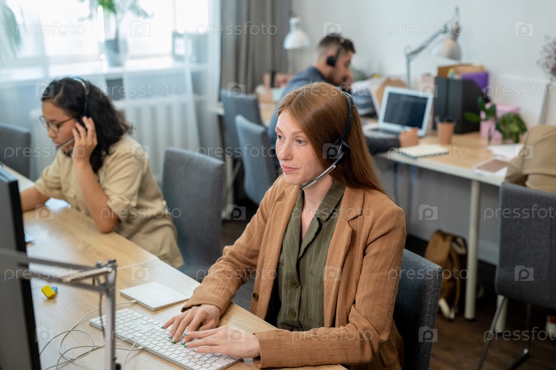 Молодой оператор колл-центра консультирует клиентов перед компьютером