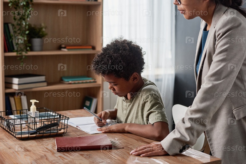 Репетитор в куртке стоит за столом и смотрит, как черный мальчик выполняет задание