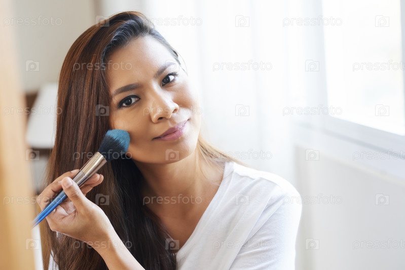 Молодая женщина применяет порошкообразный блуш