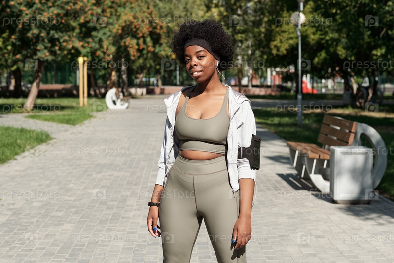 Счастливая активная женщина в спортивной одежде смотрит на тебя в парке