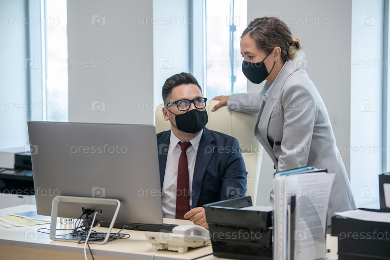 Молодая бизнесвумен и ее коллега в масках вычисляют и взаимодействуют