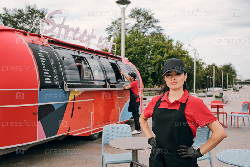 Молодая владелица пищевого грузовика стоит перед камерой