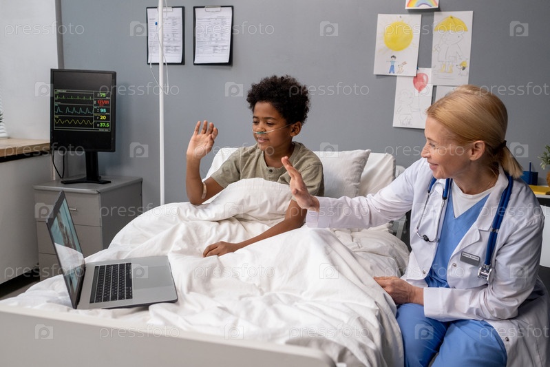 Мальчик разговаривает со своей семьей онлайн в больнице
