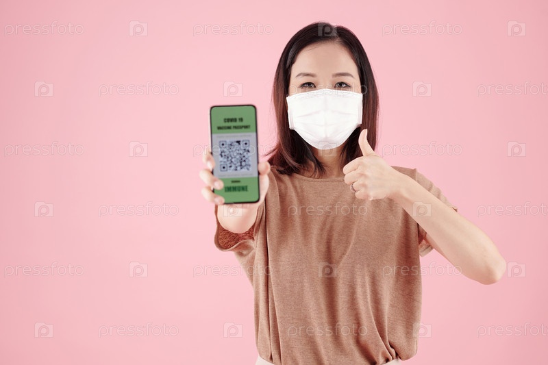 Женщина, показывающая COVID 19 Паспорт вакцинации