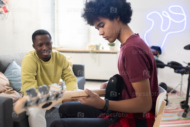 Молодой усердный студент играет на гитаре перед учителем музыки