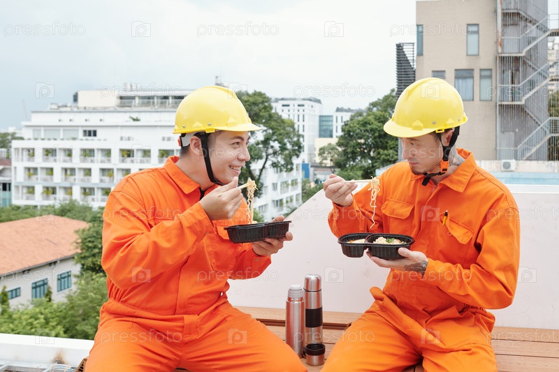 Строители обедают на крыше дома