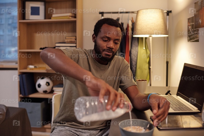 Молодой африканский мужчина наливает молоко в миску с мюсли