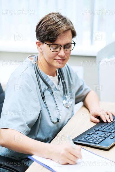 Удовлетворенная медсестра со стетоскопом на шее, сидящая за столом и делающая записи в медицинской карточке