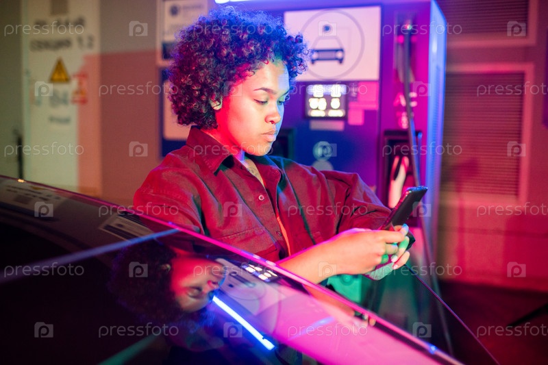 Серьезная молодая женщина прокручивает свой смартфон в машине