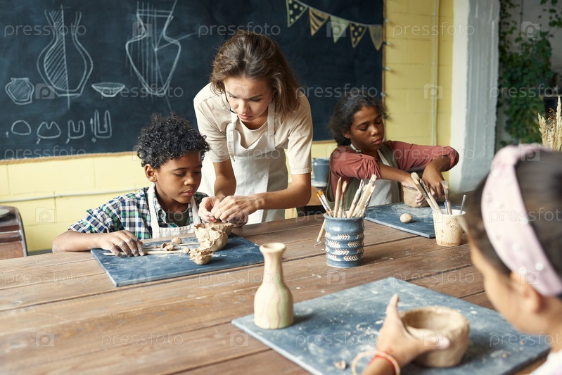 Учитель скульптуры работает с маленькими детьми