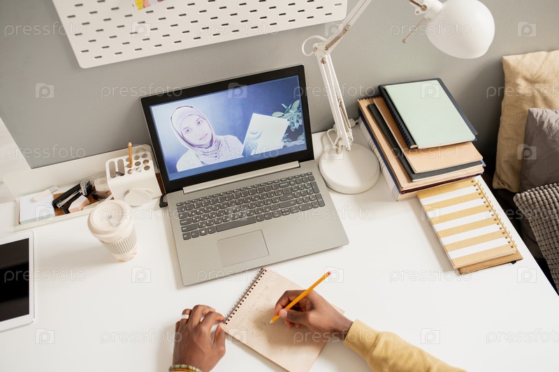 Учительница в хиджабе на экране ноутбука и руках африканского студента