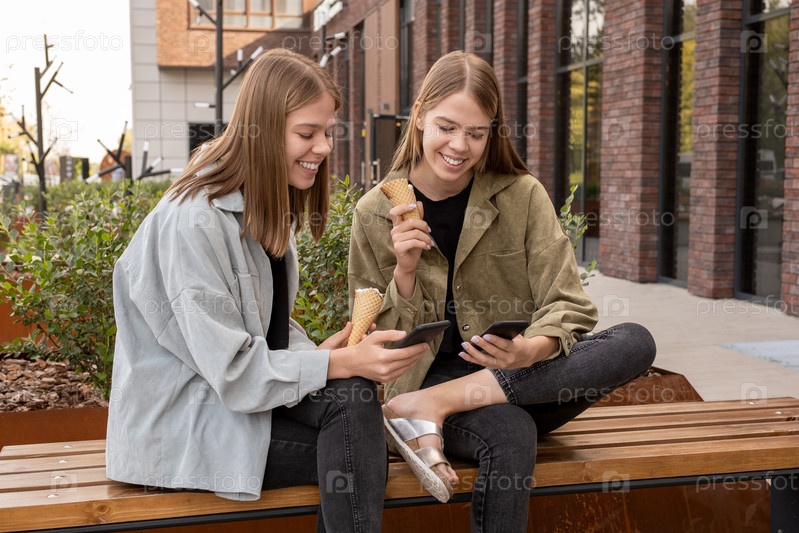 Счастливые женские сестры-близнецы с мороженым, прокручивающимся в смартфонах
