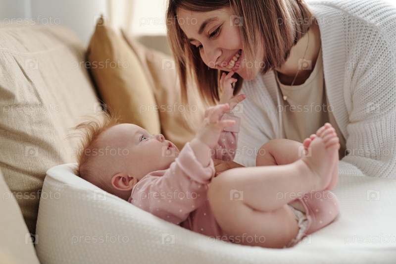 Молодая улыбающаяся женщина склоняется над своей милой дочерью