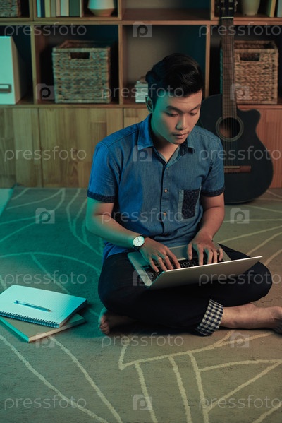 Азиатский мужчина, работающий с ноутбуком