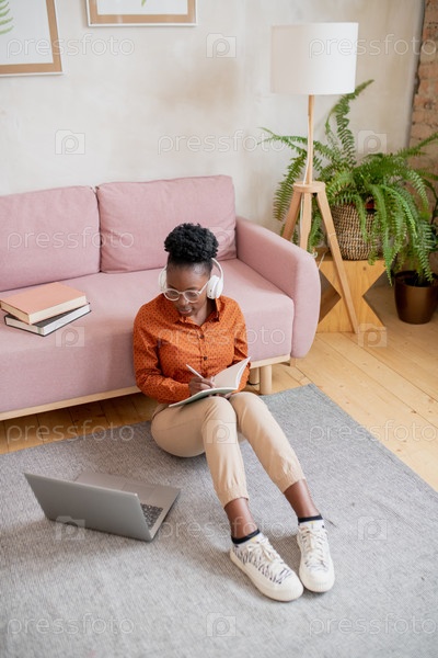 Молодой студент африканской этнической принадлежности делает заметки, сидя у дивана