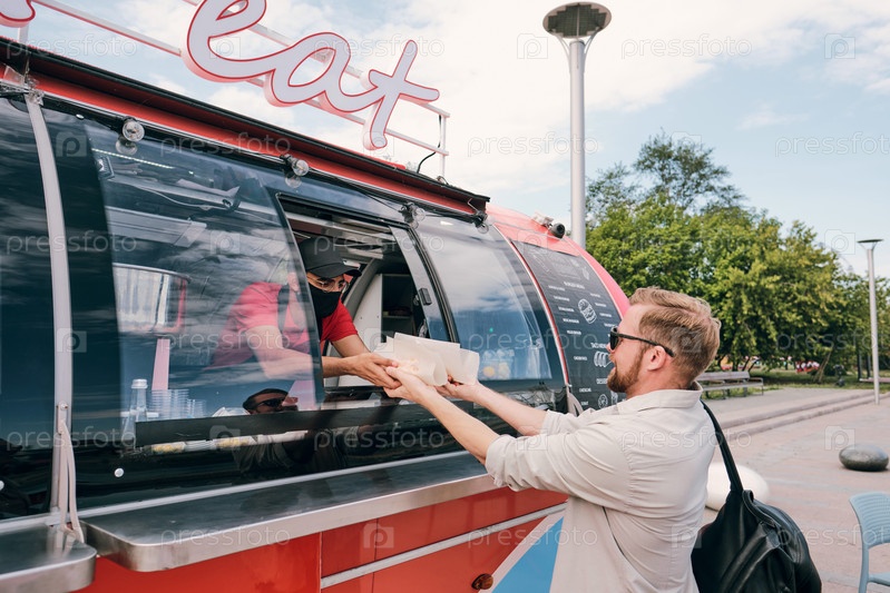 Молодой человек, занятый покупкой фаст-фуда в красном уличном грузовике
