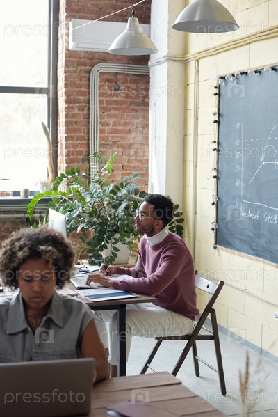 Молодой бизнесмен сидит на рабочем месте перед компьютером