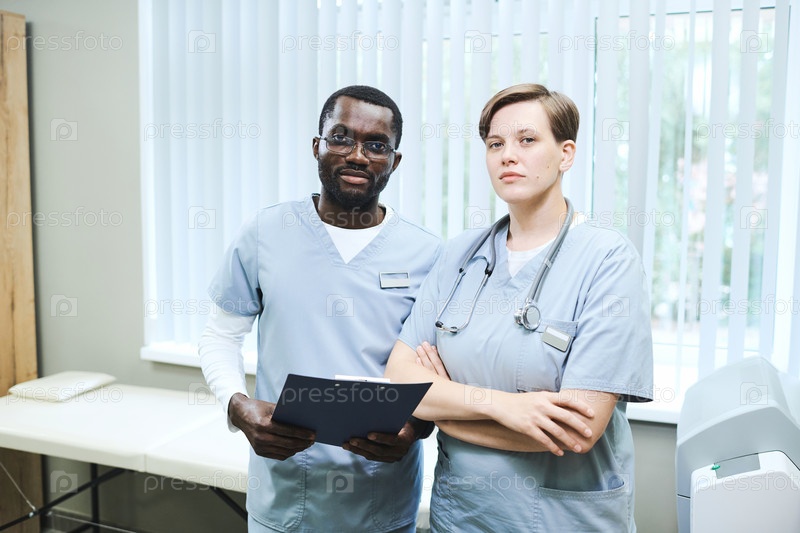 Команда молодых мультиэтнических сотрудников клиники в форме, стоящих на экзаменационном диване
