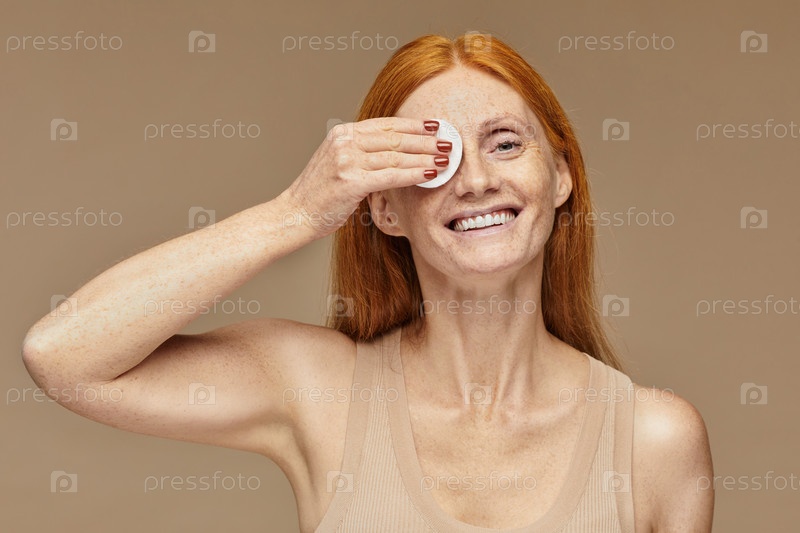 Красноволосая женщина снимает макияж