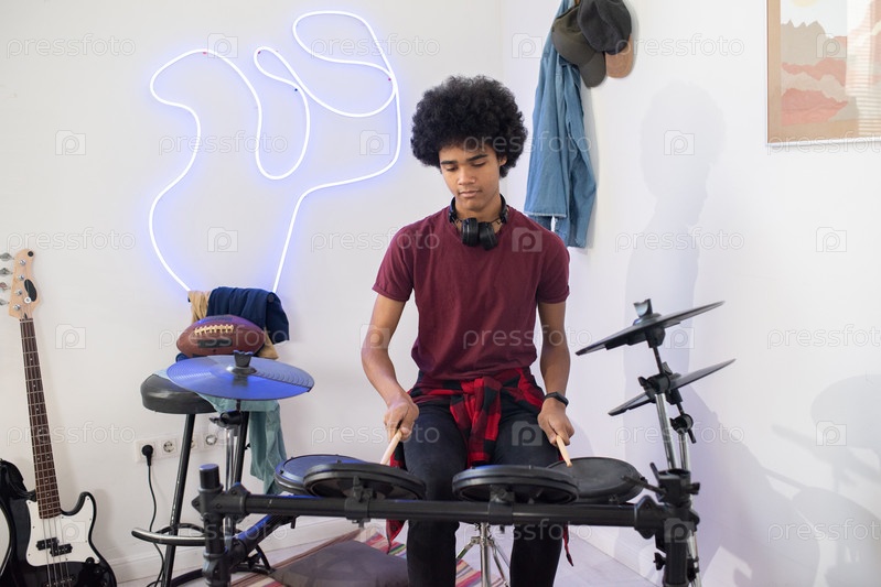 Мальчик-подросток в повседневной одежде сидит у барабанника и бьет по барабанам