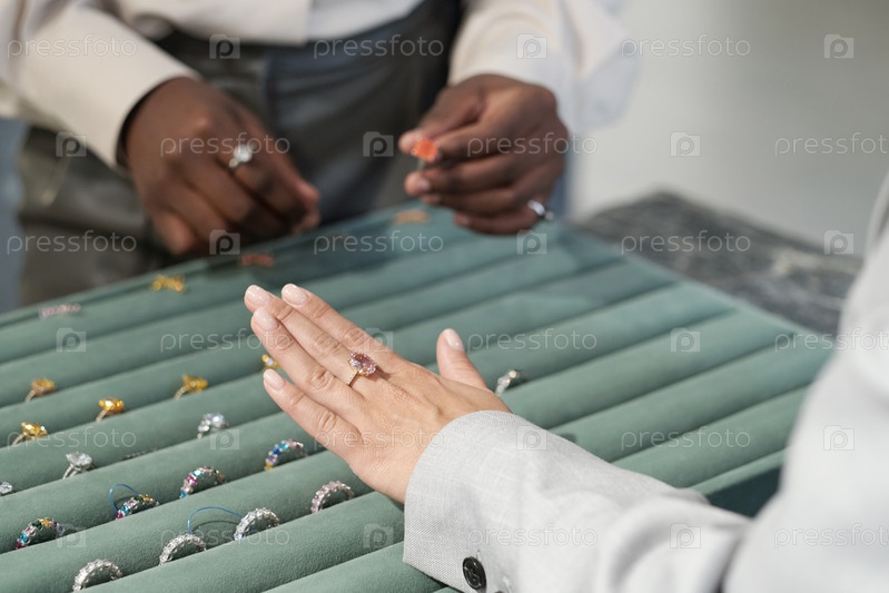 Рука покупательницы, пытающейся надеть кольцо с драгоценным камнем