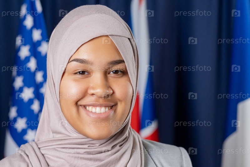 Молодая современная мусульманка-делегат в хиджабе