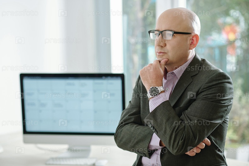 Пенсивный бизнесмен, стоящий в офисе