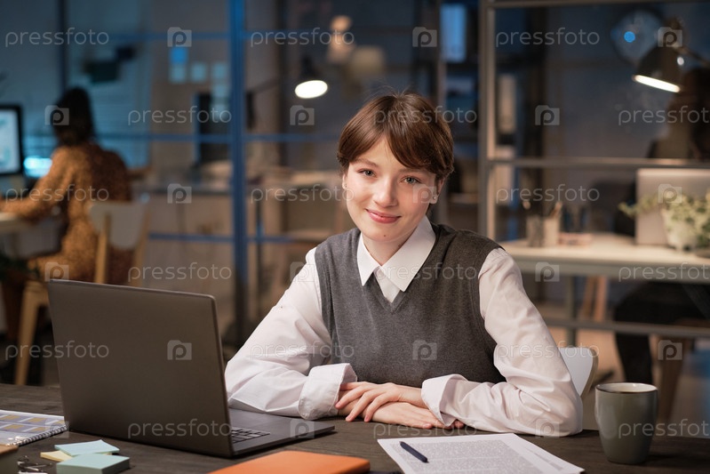 Молодая бизнесвуменка сидит в офисе
