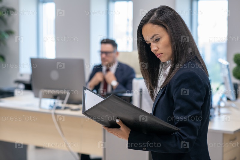Молодая серьезная брюнетка-бизнесменка просматривает документы
