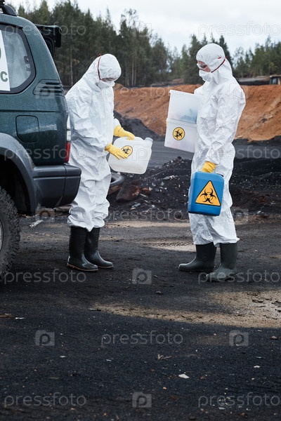 Два эколога в защитной рабочей одежде и резиновых сапогах стоят у машины на загрязненной земле и держат контейнеры для токсичных веществ