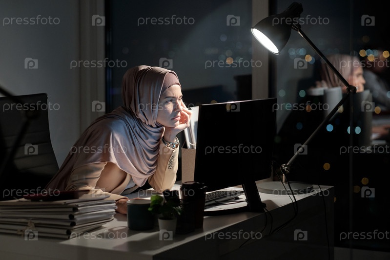 Современная офисная работница смотрит на данные на экране компьютера