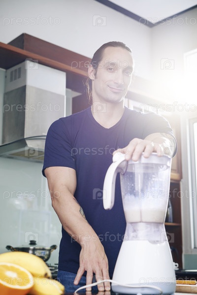 Улыбающийся мужчина делает белковый коктейль
