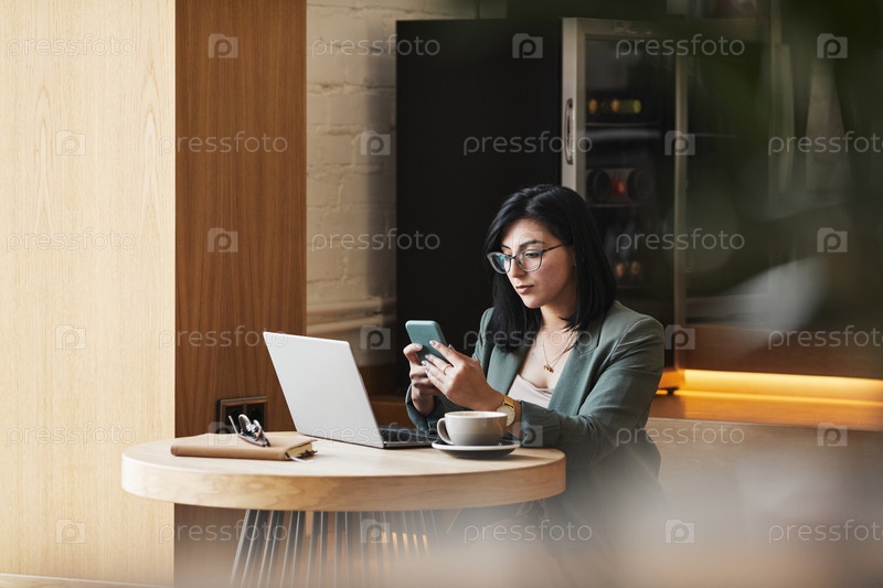 Молодая бизнесвумен, работающая в кафе