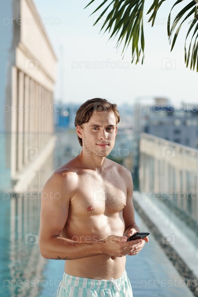 Безрукий мужчина проверяет социальные сети на смартфоне