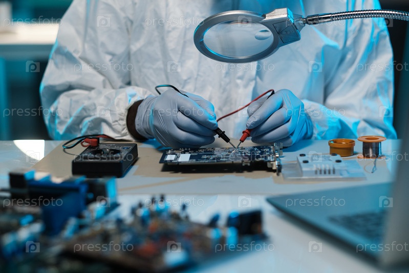 Техник в перчатках или мастер по ремонту запоить детали материнской платы с помощью пинцета