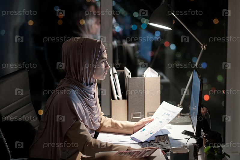 Молодая бизнесвумен с бумагой сидит перед компьютером