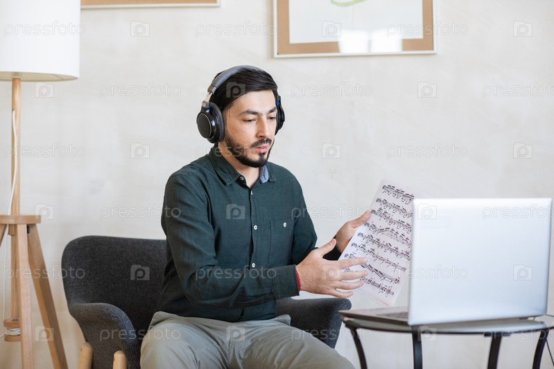 Молодой учитель музыки в наушниках общается с онлайн-аудиторией