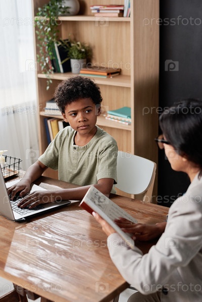 Серьезный чернокожий школьник сидит перед ноутбуком и слушает репетитора во время индивидуального занятия
