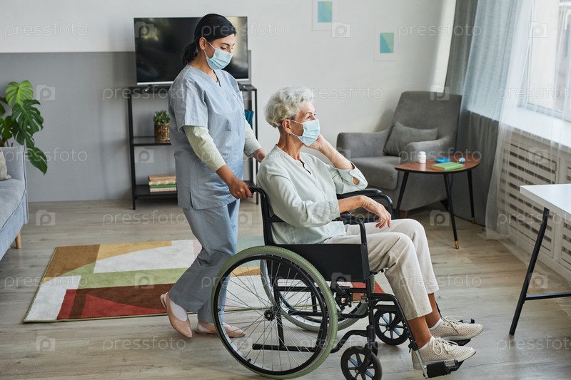 Опекун, помогающий пожилому человеку в инвалидном кресле
